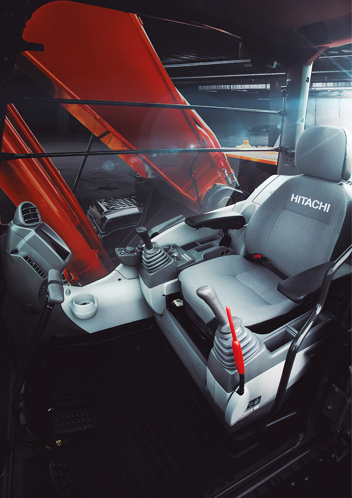The ZX300-5A excavator cockpit complies with ROPS and FOPS requirements, which provides increased operator safety, while additional lights on the boom and cockpit make night-time working more comfortable, and the rear-view camera broadens an operator’s view as much as possible.