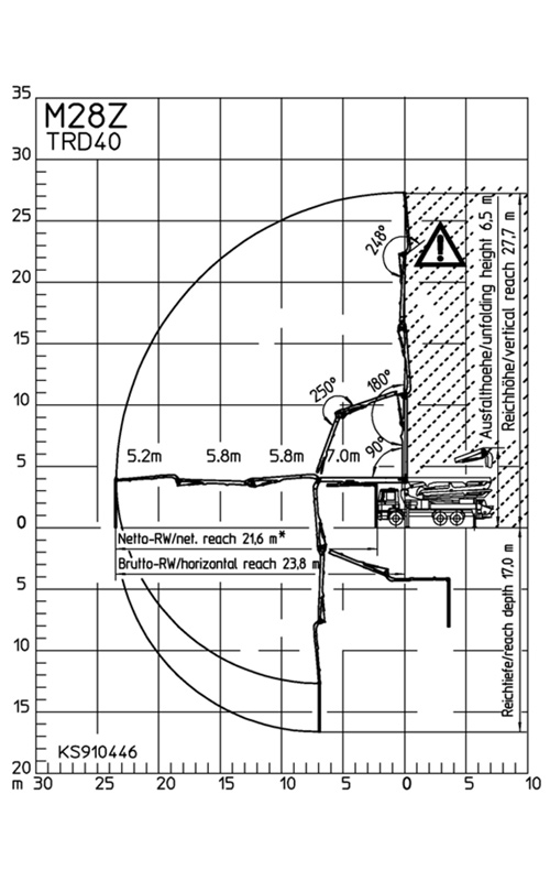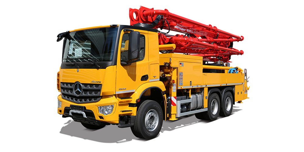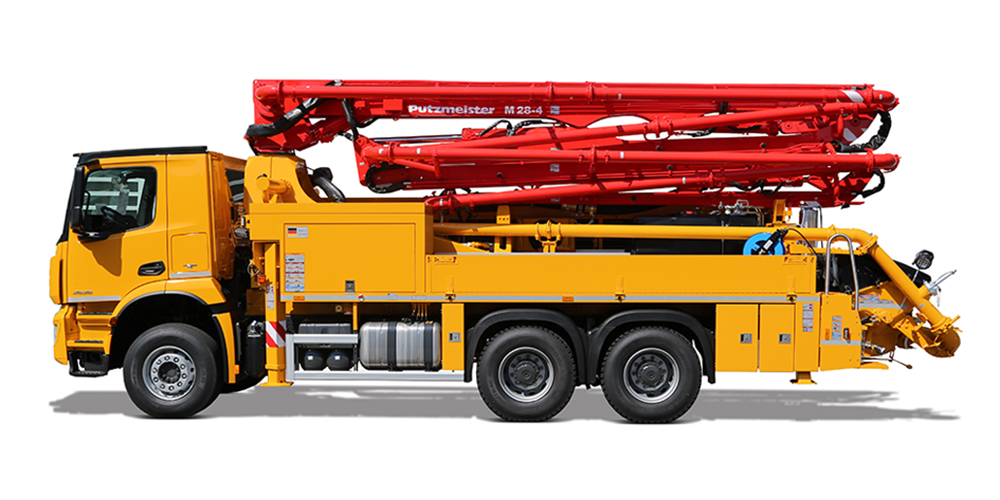 Truck-Mounted Concrete Pump featuring flexible 28-Meter Z-Fold Boom A class of its own for multifunctional applications. The flexible 28 m Z-fold boom reaches areas where other booms would have long since given up. Optional with 2-axle or 3-axle chassis for more additional accessories.