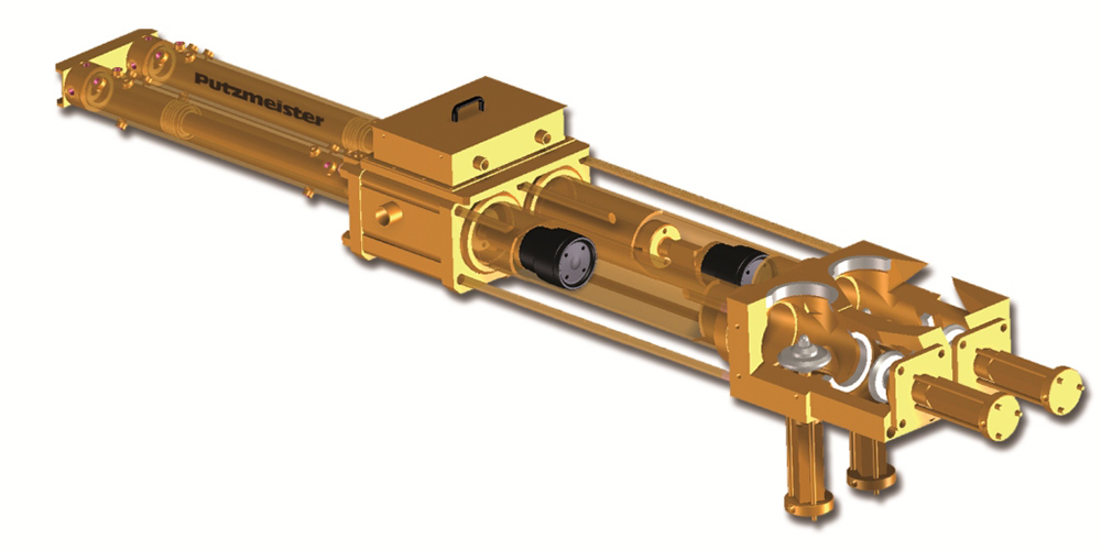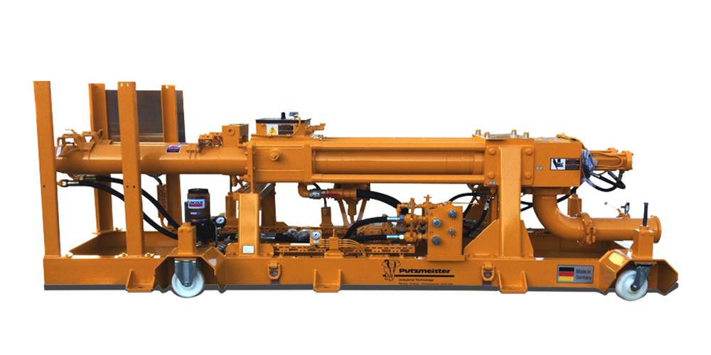 The HSP (hydraulic seat valve pump) is an oil-hydraulic piston pump with hydraulically actuated seat valves. It is used to transport highly viscous materials with a low content of foreign bodies at smaller particle sizes (diameter < .2” (5mm)). All moving parts are connected to a central grease lubrication system in order to increase the lifetime of the components.